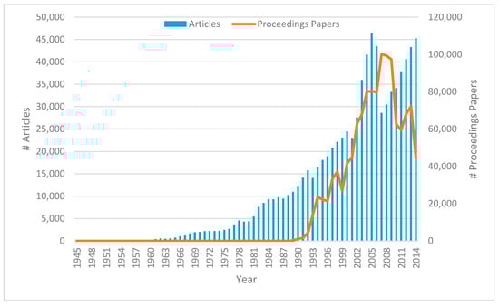 In August 2015, we acquired 1,922,652 bibliographic records (in plain text) on computer science papers indexed in Web of Science (by Thomson Reuters, now Clarivate Analytics) that were published from 1945 to 2014. These were all the records classified as “Computer Science”, i.e., our search query included the term “SU = (Computer Science)”. We will sometimes refer to these data as the “core collection”. We were primarily interested in documents of type “Article”, “Proceedings Paper”, and “Review”, but our data set also contained other document types as will be shown below. The data originated from these two databases: “Science Citation Index Expanded” and “Conference Proceedings Citation Index—Science”. These almost two million papers (or, more precisely, paper records) included 32,137,613 cited references, the most frequent of which will be disclosed later in this article. These references were most often in the form of the first author name (surname plus given and middle name initials), publication year, and publication source. There often was some additional information too, such as the volume, pagination, or even a DOI (Digital Object Identifier). Of course, many references cited items outside of the core collection (all non-computing publications, for instance) and thus form the basis of what we may call the “non-core collection”. However, disambiguation and matching of references was not part of the research described in this article. To start the analysis whose results will be presented in the next sections, we just imported the data set text files into a relational database and began submitting queries to it.