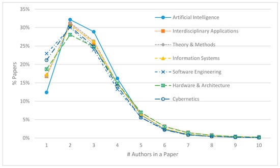 Furthermore, the most frequent number of authors in the articles under investigation was 2 (around 30% in all computer science categories), followed by 3 and 1, except for “Artificial Intelligence” where 4 was yet more frequent than 1 (see Figure 2). The largest share span exists for solo publications (with one author only): from 12.4% in “Artificial Intelligence” to 22.9% in “Software Engineering”, which can thus be proclaimed the most individual computer science discipline. This is corroborated by the mean number of authors per paper which varied from 2.67 in “Software Engineering” to 2.94 in “Hardware & Architecture”. The percentage of papers authored by 10 or more researchers was found to be minuscule in all fields of computer science.