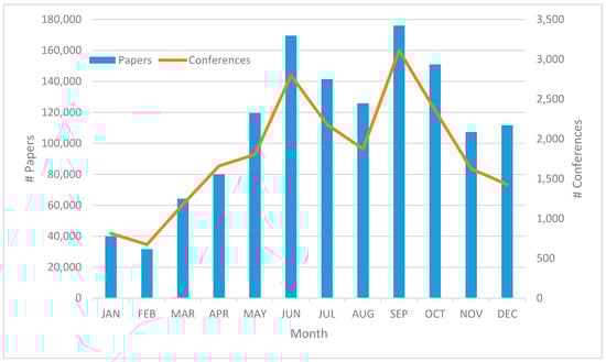 Number of papers published (Left) and conferences being held (Right) in individual months.