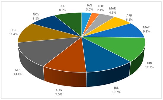 Having mentioned the role of proceedings papers in computer science, in Figure 3 we can see how the individual months of the year were attractive for conferences to be held. The red line represent the number of conferences taking place in a specific month and the blue bars stand for the number of papers published at those conferences. (If a conference spans over two months, both are counted in.) It is clearly visible in the chart that the conference “high season” starts in May and ends in October, with November and particularly December being also strong months. The weakest month is February with 673 conferences at which 31,613 papers were presented, compared to the most productive September with 3110 conferences and about 176,020 papers. The average number of papers per conference thus changes from 47.0 in February (the all-month low) to 56.6 in September. However, the largest conferences were held in December with an average of 78.2 papers per conference. The percentage shares of papers published at conferences in various months range from 2.4% in February to 13.4% in May (see Figure 4). Altogether, two thirds of computer science conference papers were presented in the high season from May to October.