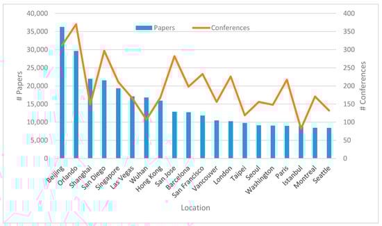 As far as the location of computer science conferences is concerned, Figure 5 shows the top 20 most popular destinations in terms of the number of conferences taking place there and the number of papers presented at them. Beijing, Orlando, Shanghai, San Diego, and Singapore are the most sought-after places for conference organizers and participants. Beijing alone hosted 312 conferences with 36,284 papers, but the most conferences (370) were held in Orlando, albeit with fewer papers (29,633). In general, we can notice that Chinese conferences tend to be larger with more papers per conference (Beijing 116.3, Shanghai 147.3, and Wuhan 157.3) than the North American or European ones (San Jose 45.7, London 45.5, and Paris 41.5). The only two other venues approaching the size of Chinese conferences are Las Vegas (103.2) and Istanbul (109.6).