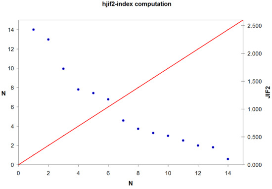 Note that our definition differs from that of Mahbuba and Rousseau for the real h-index [19]. We did not interpolate the function describing JIF succession, because these successions can be highly irregular and we did not use citations. In addition, we were not interested in the exact intersect between the interpolated function and the straight line y = x. We simply defined the hjif2-index as the JIF2 of the last journal included in the hjif2-core.