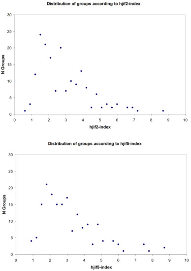 To illustrate the difference in the behavior of the hjif-index compared to the usual h-type index, we note that two different JCR groups can have similar hjif-indices but different numbers and/or percentages of journals included in their hjif-core. Furthermore, when the hjif-index increases, the percentage of journals included in the hjif-core tends to decrease. When a given JCR group contains a few very influential journals with high JIFs, only a small set of journals in this group can be considered relevant (see, for example, Figure 1). The other journals are excluded from the hjif-core, and the proportion of excluded journals vs. included journals naturally varies across groups.