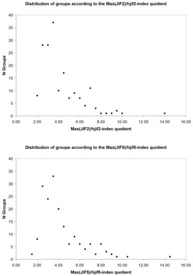 Distribution of JCR groups according to the Max(JIF2)/hjif2-index (top) and Max(JIF5)/hjif5-index quotient (bottom).