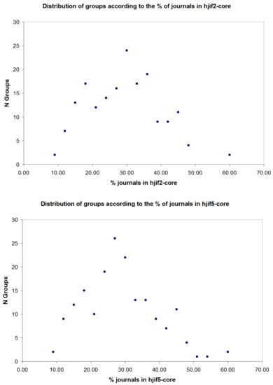 As explained above, the hjif-core includes all journals in a given JCR group with a JIF equal to or greater than the group hjif-index. We studied the distribution of groups according to the percentage of journals included in the hjif-core (Figure 4). This derived indicator estimates the size of the hjif-core relative to the size of the group.
