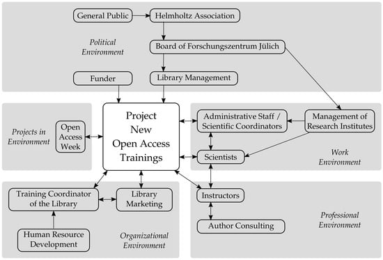 A stakeholder analysis for the project was prepared according to Alama and Gühl ([17], pp. 58–60). Stakeholders are divided into five categories: political environment, work environment, professional environment, organizational environment and projects in the environment. The result is shown in Figure 1. This stakeholder analysis, carried out in preparation of the project, played a key role in identifying the target groups of the new training courses and the actors within the library. It also provided important starting points for marketing, such as addressing the Executive Board3 and pointed out relevant incentives for the course participants, such as the guidelines of the research funders and the Helmholtz Association with which they have to comply.