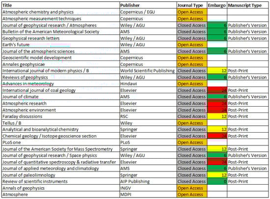 This figure shows an example list of the journals in which a research institute of Forschungszentrum Jülich published in recent years. This list is enriched with information on the journal type and whether green open access is possible in the case of closed access journals. The embargo period is given in months from the date of publication in the journal for the related manuscript type. Closed access journals that meet the embargo period accepted by Horizon 2020 are highlighted in green, and those that also meet the embargo period accepted by the Helmholtz Association are highlighted in yellow. Closed access journals whose embargo period is not accepted by any of the above mentioned institutions are highlighted in red. The presented embargo periods were collected in April 2018.