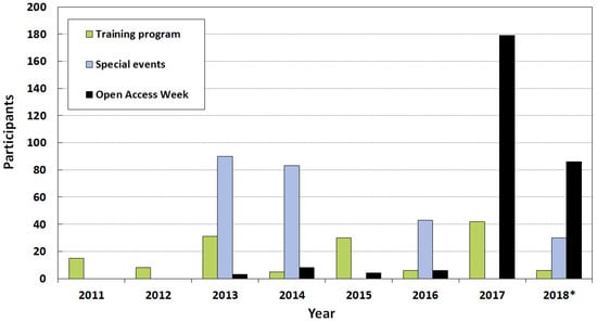 Figure 3 shows the success of the approaches and efforts of the Central Library in preparing scientists for open access. Until 2016, open access was only touched upon in a few training courses. These courses were attended by a lower number of participants than the 2017 training courses with a focus on open access. Looking at the results of the evaluation of the information events, the same pattern is clear: the number of participants in the “Open Access Week on Tour” series of events in 2017 exceeded the number for individual events of the previous years.