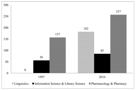 Several databases provide information on research article publishing in these areas. A tentative analysis of two major databases, Scopus and Web of Science (WoS), proved to be impossible due to incompatibility of divisions between disciplinary areas across either database. For instance, Scopus has a “Language and Linguistics” area, whereas WoS has only “Linguistics”. The category “Pharmacology and Pharmacy” exists in WoS, but corresponds to a Scopus area with six entries: Pharmaceutical Science, Pharmacology, Pharmacology (Medical), Pharmacology (Nursing), Pharmacology, and, finally, Toxicology, Pharmaceutical (Miscellaneous) and Pharmacy.