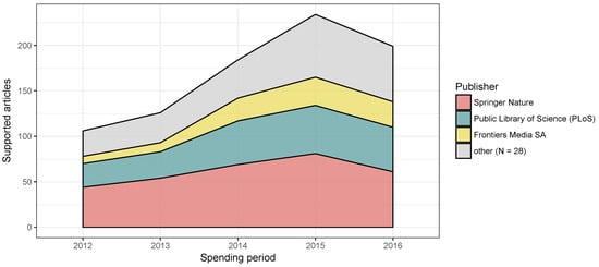 To date, SUB Göttingen manages one of the largest publication funds for open access publication fees among German universities in terms of the total number of financially supported articles reported to the Open APC initiative17, an open data effort for sharing information about institutional spending on open access publication fees. Figure 1 shows the annual expenditure of SUB Göttingen on publication fees from 2012–2016 aggregated by publisher. While funding for open access articles increased over the period, a slight drop in 2016 can be observed because of less publications in fully-open access journals published by Springer Nature. Our future work will, therefore, focus more on analyzing the overall publication output from researchers affiliated with the University of Göttingen in order to better understand these yearly differences.