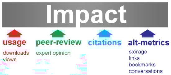 Citations (how many and by whom) as the traditional “currency” of the scientific marketplace can be complemented by other measures assessing impact and quality: peer-review, usage statistics and alternative metrics. Together with citation counts, they reflect different angles of impact of scientific outputs [33] as shown in Figure 2.