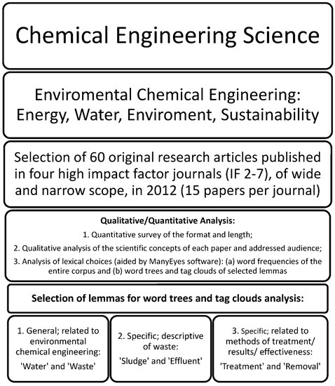 Hence, this paper aims to identify and investigate the register of 60 published manuscripts in four different journals of impact factor above two. All four journals publish original research papers in the field of chemical engineering science, and specifically in one of its most prominent and complex subject areas, environment conservation and sustainability, focusing on wastewater treatment (Figure 1). This study explores possible links (or lack thereof) between the impact factor and scope of each journal, on the one hand, and the register of the manuscripts (with a focus on lexical choices and discourse moves), on the other. To the authors’ best knowledge, register variation between different types of published, professional original research articles has not been researched. This paper thus aims to investigate how lexical choices and the content of scientific manuscripts relate to the advertised scope and impact factor of the journal, in which they are published. This can contribute in helping chemical engineering researchers better adapt their papers to suit the specific register of their chosen journal, so as to positively influence their publication record and career prospects, and to attract citations and possible collaborations.