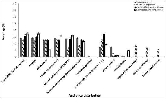 The topics covered in the papers in our sample were found to be of potential relevance to a broad audience, not restricted to academia, but also to other bodies such as policy regulators, small- and medium-size companies and enterprises, or environmental agencies. In fact, the collected papers addressed an audience of thirteen categories varying from water and environment specialists to microbiologists and chemists, as well as governmental bodies, water and wastewater companies (national, private) or regulatory policies agencies and law developing and forming bodies (Figure 4). This is a divergence from the advertised audience in the website of each journal, where the focus is on specialists in chemical engineering audience within the field.