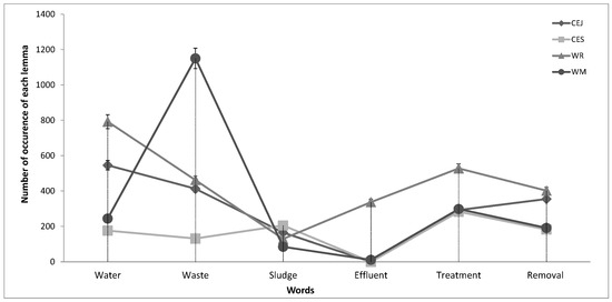 Both lemmas “water” and “waste” were routinely found in the manuscripts of each journal, and they were among the top 10 most frequently encountered words in the manuscripts, and were used in high frequency either combined—i.e., wastewater—or separately (Table 2). However, as the analysis of the visualisations indicates, in CEJ and CES, the terms were recurrently employed in contexts different from WR and WM. In CEJ and CES the words are used in a rather specialised context compared to WR and WM, an interesting observation that did not confirm the authors’ expectations, since both journals are of wider scope (Table 1), and it was anticipated that a less restrictive use of the term would have been encountered. In CEJ and WR, the words were found in analogous amounts; while in CES the amount of use was very limited, suggesting the use of a scientific specialised vocabulary (e.g., the terms “liquid” or “fluid” or “solvent”, were preferred over “water”). On the other hand, WM stood out, since the lemma “waste” is used very frequently, suggesting a broader approach to the subject (i.e., industrial, agricultural, slaughterhouse, domestic, municipal waste).