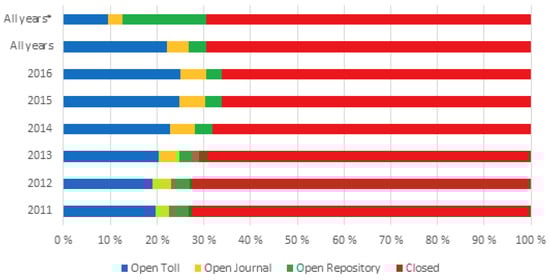 - Bosman, J.M.; Kramer, B. Open access levels: A quantitative exploration using Web of Science and oaDOI data. PeerJ Preprints 2018, 6, e3520v1. [Google Scholar]