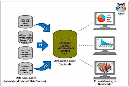 A current research information system (CRIS) is a specialized database or federated information system to collect, manage and provide information on research activities and results, such as projects, third-party funds, patents, cooperation partners, prices and publications [,,]. The building blocks of a CRIS architecture can be described as a three-stage structure [] (see Figure 1).