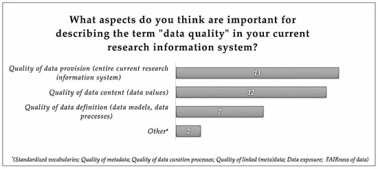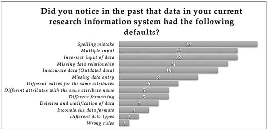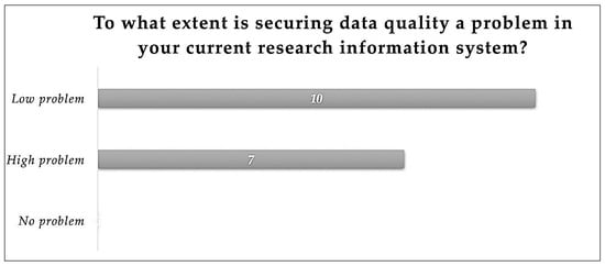 The results from the last question may be surprising—less than half of the sample of CRIS administrators and experts consider data quality to be an important problem. This is quite different compared to former studies, where quality issues were considered as a crucial topic for CRIS development and management ([]; see above, Section 2.3), and it probably reflects the users’ satisfaction with their CRIS, their quality in terms of reliable functioning and trustworthy results, as the CRIS technology has reached a certain level of maturity. However, we must keep in mind that this may be the particular opinion of a small group of experts deeply committed to this technology, as project leaders, system administrators, etc.