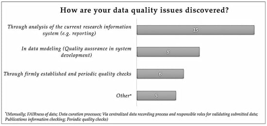 Most experts indicated that they discovered data problems through an analysis of the system, with the help of business intelligence tools, through reporting, etc. Half of the respondents identified problems via data modeling and formal quality assurance during the development of the CRIS, while one third of the experts control the quality of their data through well-established, regular quality checks. Other methods seem less important, such as manual quality checks and formalized data curation processes.