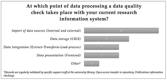 Most experts indicate that their quality check takes place at the interface of the CRIS with other, internal or external systems, when ingesting data into the CRIS. Half of the experts mention three other “check points”, the data storage, the data presentation (frontend) and the ETL process. Other respondents said that they control the quality of export to the open access repository, that they specifically check the control of publication records (input), and that all records are regularly validated by trained librarians, without specifying which records.
