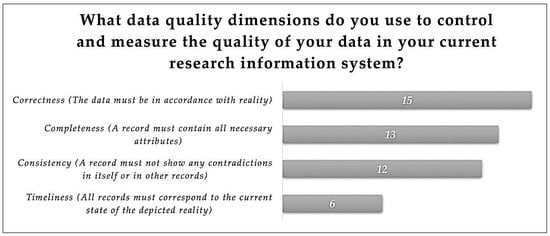 The methods of handling the data quality issues in CRIS are varied and depend on the importance of the problem, the context of the application, and the cause of the problem. The scientific literature discusses above all four dimensions which can contribute to high data quality in CRIS, i.e., completeness, correctness, consistency and timeliness, which have proven to be easy to measure, represent a particularly representative illustration of the reporting for the CRIS users and lead to an improved basis for decision-making. The sample of experts were asked which one they would use to test and measure quality in their system (see Figure 6).