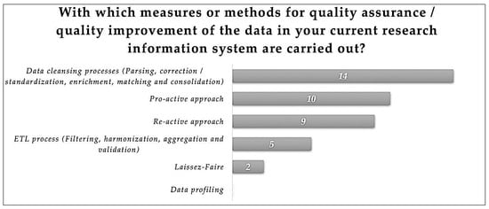 According to the experts’ answers, the preferred approach to quality assurance are various data cleansing processes, such as parsing, enrichment or consolidation, followed by pro-active and re-active methods. Other methods seem less important; in particular, ETL processes (filtering, etc.), laissez-faire and data profiling, but similar to quality dimensions (see Figure 6), we must keep in mind that most respondents provided two or three answers, confirming that they consider CRIS data quality to be a multidimensional concept which needs more than one approach.
