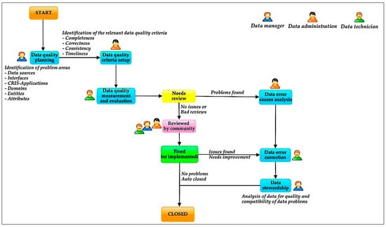 Data monitoring is certainly an effective method, so it is advisable to establish a permanent data quality team in universities or research institutes that can coordinate and monitor the individual measures of the current data quality project and systematically identify errors through reproducible data analyzes []. Figure 12 illustrates a process flow for managing and monitoring problem records in the context of CRIS.