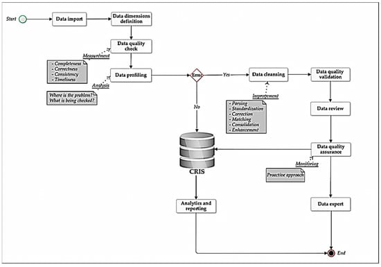 All these mentioned steps are essential for achieving and maintaining maximum data quality in current research information systems [,]. Errors in the collection, transmission and integration of multiple internal and external data sources in a CRIS are eliminated by the data cleansing [,].