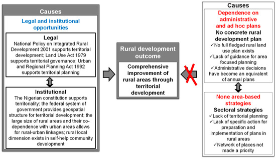 In order to confirm or refute the first hypothetical proposition (that is, “Legal and institutional opportunities for territorial development exist”), it was possible to provide evidence (proof) through literature and data (including the “Nigerian constitution, legislation and its rural development policy”) to show that there are “legal and institutional opportunities for territorial development” (illustrated in Figure 2).
