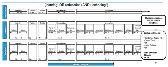 Prior to conducting specific searches and selecting the 23 datasets, all of the datasets within two relevant data repositories—Mendeley Data (international) and Zenodo (European)—were explored. Table 2 shows the numbers for Social Sciences and Educational Technology as research areas.
