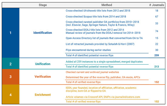 For the purposes of this study, we created and curated a dataset—available on Zenodo [56]—that includes the following core data: ISSN, year the journal was founded, year of the reverse flip, country of journal affiliation, journal affiliation, journal title, publisher, access mode, academic discipline, OA history (born-OA/flipped-to-OA), and embargo period. Since no single data source exists that tracks the OA status of journals over time, we consulted several different data sources—Scopus title lists [57], journal title lists provided by publishers, title lists by the Directory of Open Access Journals (DOAJ) [58], the OAD list of reverse-flip journals [22], previous studies [37,45,46,47], and Ulrichsweb [59]—in order to create a dataset that is as comprehensible as possible. With the exception of Ulrichsweb and journals encountered during earlier research projects by the authors, we only used sources that are publicly available on the Internet, although sometimes difficult to find. We collected the data manually and did not follow a uniform method since each data source required a unique approach for extracting the information. Moreover, all our data sources have very noisy data concerning the identification of reverse flips, which required manual verification to confirm that a reverse flip had occurred.