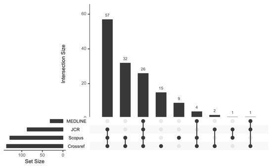 - Conway, J.R.; Lex, A.; Gehlenborg, N. UpSetR: An R package for the visualization of intersecting sets and their properties. Bioinformatics 2017, 33, 2938–2940. [Google Scholar] [CrossRef] [PubMed]