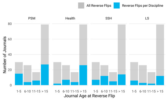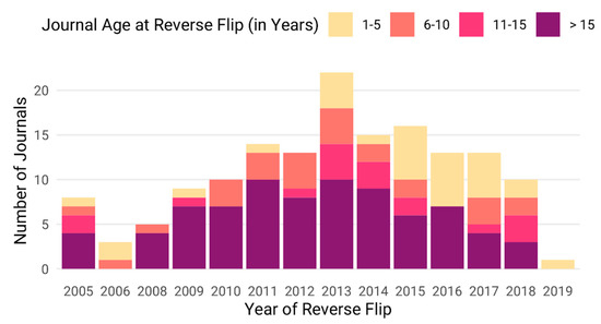 While the last two studies affirm the relevance of our paper by addressing reverse flips as secondary research results, we draw on the following two for interpreting our findings. Björk et al. [47] examined the OA status and publishing activity of 250 independent born-OA journals founded prior to 2002 (independent defined as not being published by a professional publisher). In 2014, 115 journals were still active and fully OA, 100 journals had ceased publication, 23 had disappeared from the Web completely, and the remaining 12 journals had reverse-flipped to subscription access. Likewise, Crawford [48] studied 86 journals that were classified as OA in 1995, and found 49 (57%) of the journals to still be publishing in 2000. Crawford [48] observed a common pattern among the discontinued or comatose journals, coined the “arc of enthusiasm”, where a new journal thrives for two to five years, but the flow of articles begins to decline after the highs of the first and second year. We turn to these studies when considering the time frame within which reverse flips occurred, with particular attention to newly founded OA journals. In both Crawford [48] and Björk et al. [47], most journals remained active during the first two to five years, whereas the mortality rate rose during the critical six to nine-year period. After that, the number of ceased journals decreased sharply and journals still actively publishing at that point had reached higher stability. In addition to briefly reporting observations on reverse flips, Björk et al. [47] highlight that maintaining momentum in publishing activity is a common trait among surviving journals, whereas it is rare for journals to recover after a period of inactivity.