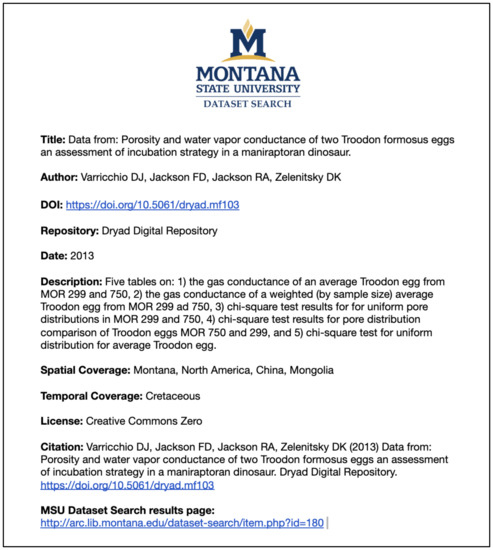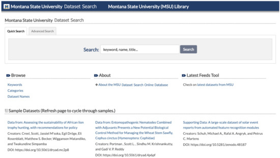 20]. Dataset Search automatically harvests metadata for MSU-affiliated research datasets using data repository feeds and APIs, which are parsed using PHP scripts. After undergoing deduplication and human curatorial review, metadata records are saved in a local database. A user interface allows users to search and access the metadata records (see