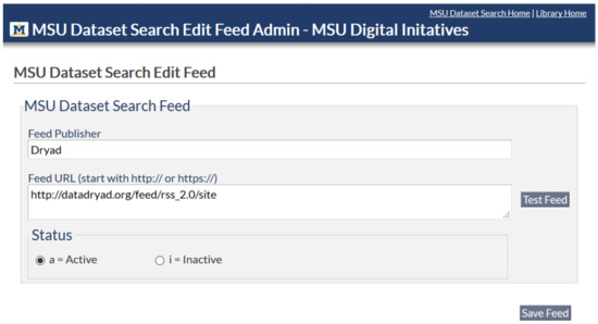 Users wishing to adopt the Dataset Search open source code will first add a selected feed using the Edit Feed web form, as shown in