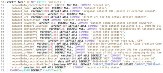 Figure 6, below, shows all of the present fields in the “Datasets” table. Of note here, are the ‘dataset_RepositoryName’ and ‘dataset_doi’ fields which allow us to understand the provenance of the dataset and where our faculty and researchers are depositing data. We are also watching for times when we can control the vocabulary of our metadata fields. For example, repository names can be variable, and we are considering a level of human review to standardize this metadata or using the prefix of the DOI [