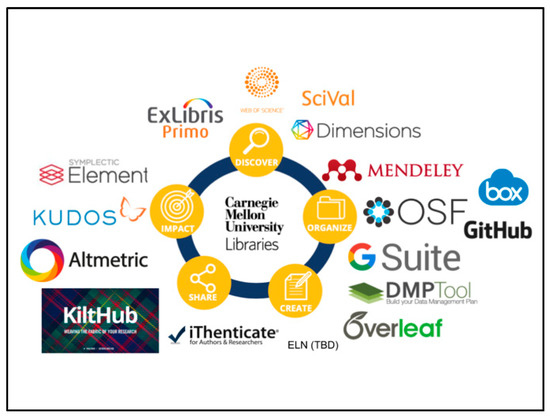 The role of the repository will continue to change and evolve as the needs of researchers and administrators evolve as well. In this way, the repositories’ dialectic will continue to add additional “faces” [44]. The number of tools and services designed to assist with scholarly communications is increasingly expanding. New tools and services have been created to fill voids where previous support either did not exist, or was inadequately provided. In 2015, Jeroen Bosman and Bianca Kramer presented their findings on their 101 Innovations in Scholarly Communications” at the Force 11 2015 meeting [62]. To date, Bosman and Kramer have identified over 400 different systems, tools, and services [63]. Their work also identified that these innovations could be classified into six different stages (Discovery, Analysis, Writing, Publication, Outreach, and Assessment), which represent a researcher’s workflow. In comparison, the University Libraries has classified its tools and services into a similar model also reflecting the researcher’s workflow. As Figure 3 illustrates, the University Libraries differs from Kramer and Bosman, in that it has identifies only five stages. The five stages represented at CMU are Discover, Organize, Create, Share, and Impact. With these five stages, the University Libraries has classified the services, tools, and platforms that it maintains, supports, or licenses to support the endeavors of its faculty and students throughout the stages of their research and scholarship.