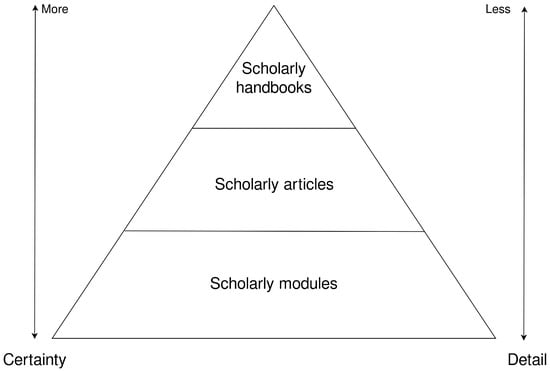 Modular scholarly outputs, each a separate step in the research process, could supplement the scholarly article (as detailed in [16]). Scholarly textbooks and monographs (i.e., vademecum science; [17]) communicate findings with few details and a high degree of certainty; scholarly articles present relatively more details and less certainty than textbooks, but still lack the detail to reproduce results. This lack of detail is multiplied by the increasingly complex research pipelines due to technological changes and the size of data processed. Moreover, textbooks and articles construct narratives across findings because they report far after events have happened, and this is what editors expect. Scholarly modules could serve as the base for scholarly articles, reporting more details, less certainty of findings, and where events are reported closer to their occurrence. Granular reporting may help facilitate a shift from authorship to contributorship [18] and could facilitate reproducibility (i.e., it is easier to reproduce one action with more details than multiple actions with fewer details per action); earlier reporting could facilitate discussion by making it practical for the research process (extending the idea of Registered Reports; [19]) and making content easier to find and reuse. As findings become replicated and more consensus about a finding starts to arise, findings could move up the “chain” and be integrated into scholarly articles and textbooks. Articles and books would then provide overviews and larger narratives to understand historical developments within scholarly research. Figure 2 provides a conceptual depiction of how these different forms of documenting findings relate to each other.