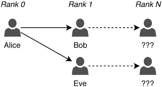 Using the follows property, Alice can propagate her feed deeper into her network, as depicted in Figure 4. More specifically, Alice’s personal profile, rank zero in the network, extends to the people she follows (i.e., Bob and Eve are rank one). Subsequently, the profiles Bob and Eve follow are of rank three. By using recursive functions to crawl the extended network to rank N, edges in the network are easily discovered despite the (potential) lack of direct connections [24].