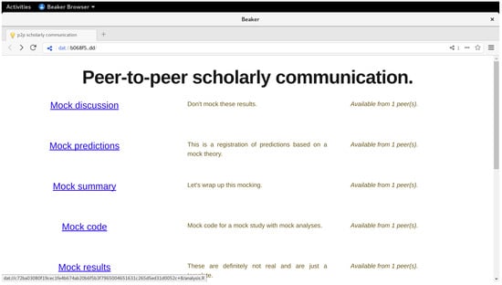 In order to show that decentralized, modular scholarly communication is not just a hypothetical exercise, I developed a minimal working prototype. The prototype code supplied below currently only functions within the Beaker Browser because specific Application Programmatic Interfaces (APIs) that directly interface with the Dat protocol are not yet available in the most commonly-used web browsers (e.g., Mozilla Firefox, Google Chrome).