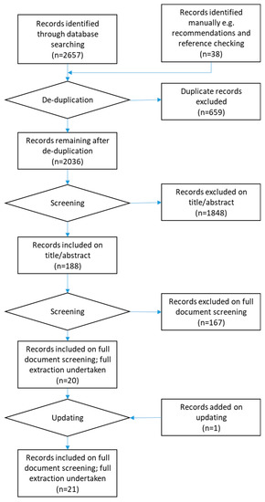 - Liberati, A.; Altman, D.G.; Tetzlaff, J.; Mulrow, C.; Gøtzsche, P.C.; Ioannidis, J.P.A.; Clarke, M.; Devereaux, P.J.; Kleijnen, J.; Moher, D. The PRISMA statement for reporting systematic reviews and meta-analyses of studies that evaluate healthcare interventions: explanation and elaboration. BMJ 2009, 339, b2700. [Google Scholar] [CrossRef] [PubMed]