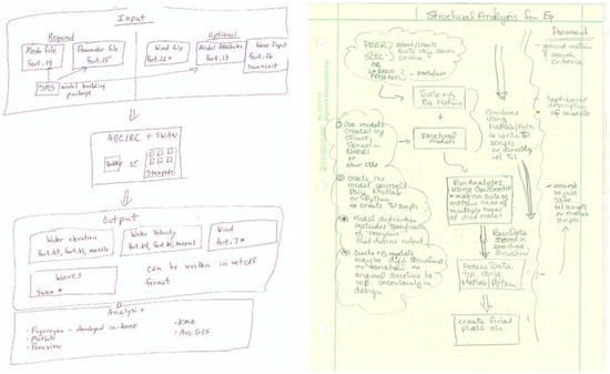 Drawings of research workflows made by simulation experts: Clint Dawson (storm surge simulation) (left); and Laura Lowes (structural simulation) (right).