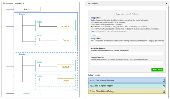 A data model underlies how data are organized and described in a system. It establishes how to group files, how to describe them, and their relationships. Faced with large numbers of files to organize and much to explain about the simulations, we designed a simulation data model to allow adding files to categories as big buckets [24]. To define relevant categories around which data and documentation could be grouped, we considered the commonalities in processes and terms found across the different simulation workflows contributed by the experts. The final categories represent processes in a simulation research lifecycle and the category label becomes provenance metadata about the files added to it, allowing consistent data organization across diverse simulation projects. The categories, their correspondence to research data and curation lifecycle stages [25,26], and their definitions are in Table 1.