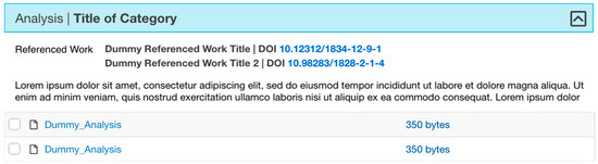 We introduce two ways for representing data publications: browsing and tree navigation (see Figure 7, Figure 8 and Figure 9). Simulation datasets can be very large to fit in one screen, causing the user to scroll too much. The browsing view presents the dataset with all the metadata and access to the files in a nested accordion view in which each segment/tab of the accordion is a category. The accordion view allows a general understanding of the project’s structure. Users can expand one tab at a time or view the entire dataset (Figure 7). Within each category, the nesting format shows the category descriptions, corresponding files, and the folder or file tags that illustrate and clarify their contents (Figure 8). A complementary tree view (in Figure 9) provides quick navigation capabilities. Clicking on a category title lands on the corresponding section of the simulation browsing view. Both views enable navigating the dataset in relation to the files’ provenance and in context with the complete structure of a project [11,23].