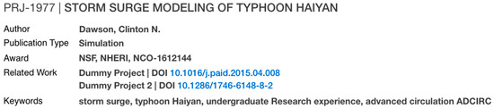 Simulations often reuse data as input files [37,39,41]. Many of these data are open, from agencies such as FEMA and NOAA [40,42]. To facilitate citing reused data in the landing pages, we implemented the Related Work metadata element, which allows inserting citations for reused data with respective DOIs, or with a URL when available (see Figure 10). Data reuse is related to data licensing. We offer different licenses for users to choose from and provide explanations about the impact of their licenses in their new publications in a Frequently Asked Questions section whose link is available throughout the curation and publication interfaces.
