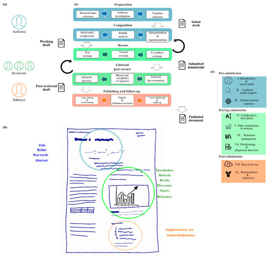 Peer-review process. (a) Stakeholders; (b) editorial process; (c) Information Technology and Communication (ITC) assisting tools software taxonomy.