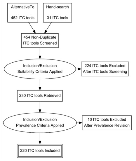 Due to the lack of studies of the ITC tools in online databases, a hand-search methodology was used on a selection of reference materials for authors, reviewers, and editors. Examination of these sources supported the development of a general taxonomy for software and lead to the identification of representative cases of software solutions that were used subsequently to find additional category members using AlternativeTo as a search engine for retrieving ITC tools for evaluation.