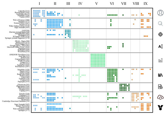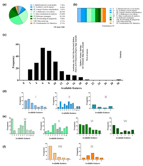 Prior to examine the ITC tools, the authors established the following nine categories and 70 features by consensus: (I) Identification and social media, (II) Academic search engines, (III) Journal-abstract matchmakers, (IV) Collaborative text editors, (V) Data visualization and analysis, (VI) Reference management, (VII) Proofreading and plagiarism detection, (VIII) Data archiving, and (IX) Scientometrics and Altmetrics.