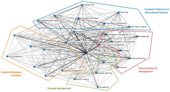 In addition to the core of competence-based management, composed by the terms knowledge management, competence management, and management, it was also possible to identify four other macro-categories by the grouping of the other keywords. Those are: computer sciences and informational systems; human resources management; strategic management, which is highly related to the core; and industrial relations and labor.