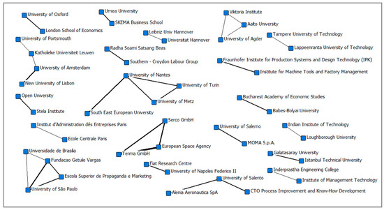 Collaborations between institutions do not configure a dense collaboration network. This characteristic can be justified by the fact that there is not a leading research institution in this area—an aspect that decentralizes the studies and minimizes the possibilities of experiences’ exchanges. It is important to note, in Figure 4, the high incidence of papers in collaboration with the European space agency (ESA) and the companies Terma GmbH (Darmstadt, Germany) and Serco GmbH (Darmstadt, Germany), which are specialized in aerospace products and services management, respectively, which reinforces these collaborations.