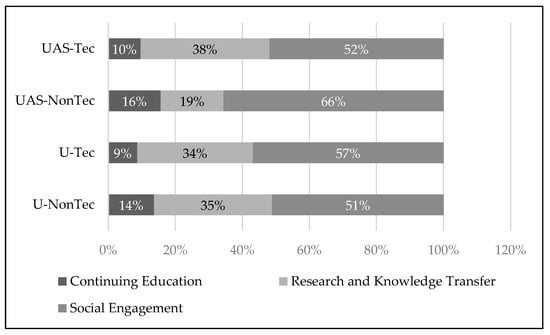 To assess the Third Mission profiles of those universities and obtain a better understanding of the comparability of the cases, documents available on the Internet were collected and analyzed: University or faculty homepages, annual and research reports, research databases, university magazines and brochures. This resulted in a list of activities assigned to specific Third Mission items (in accordance with the systematization in Reference []) for each case. These items were assigned to either continuing education, research and knowledge transfer or social engagement. Overall, there were no stark differences in the Third Mission profiles of the universities compared by the number of activities in each field. Only the non-technical university of applied sciences displayed a focus on social engagement and fewer activities in research and knowledge transfer that differed from the rest (Figure 1).